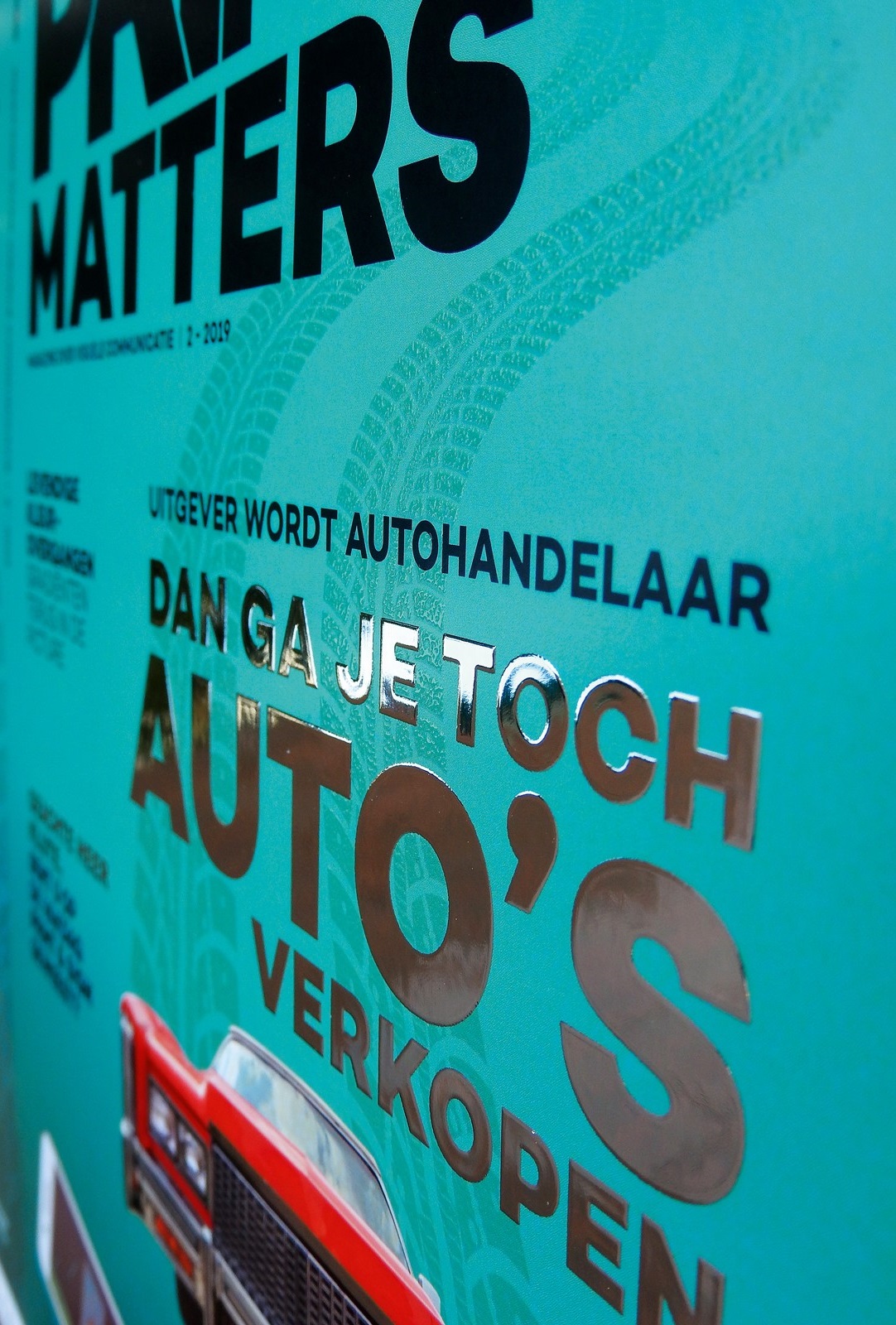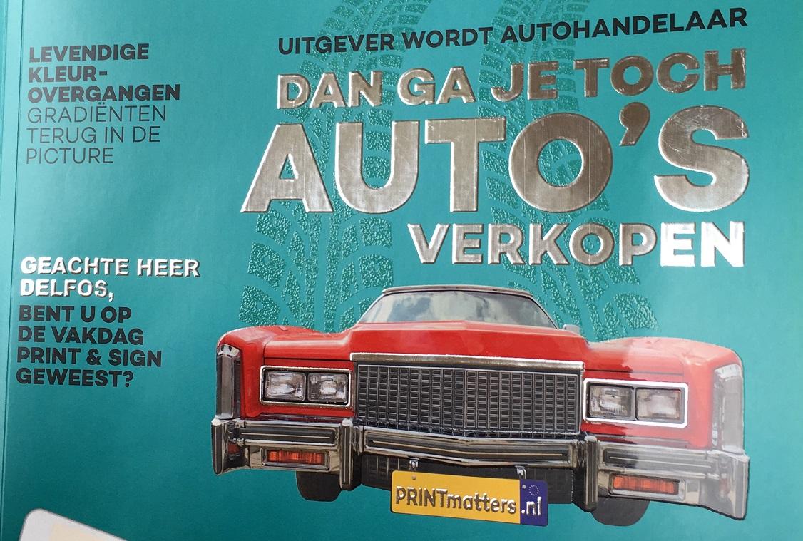 De veredel-printer kent nog veel meer bijzondere kunstjes. In dit geval hebben onze vormgevers Anita Baljet en David van Eck een mooie Amerikaanse auto op de cover voorzien van in 3D reliëf geaccentueerde 3D chroom-elementen en is een bandenspoor zichtbaarpuur door uitsluitend het gebruik van 3D lak-textuur. De stevige kop van het artikel over een Britse uitgever die het businessmodel flink diversifieert luidt: ‘Dan ga je toch auto’s verkopen’. Ook deze is via print van zilverfolie gerealiseerd.